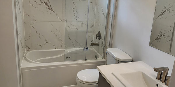 Solution : Agrandissement de la douche, installation d’un meuble-lavabo sur mesure et sélection de matériaux résistants, élégants et faciles d’entretien.